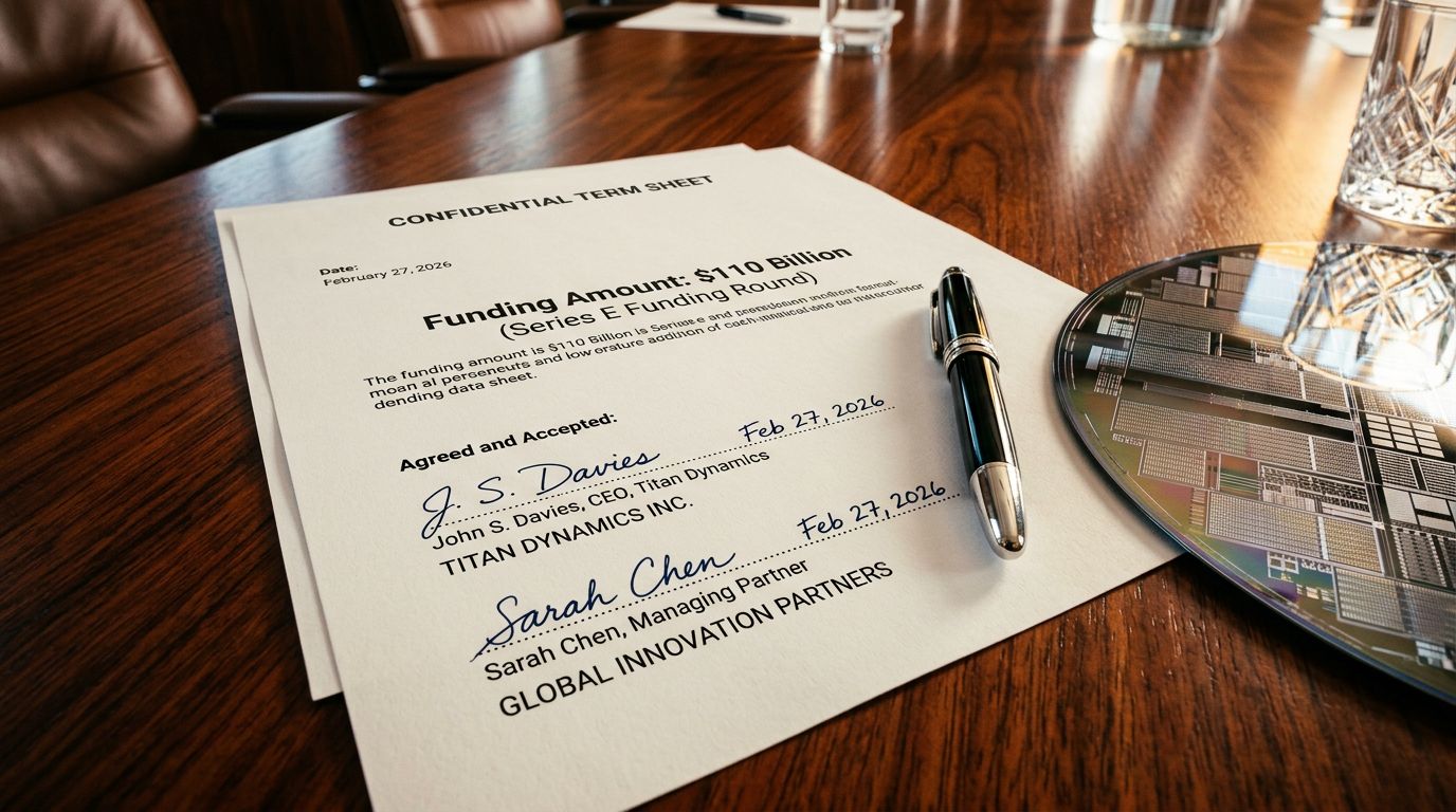 Look at this signed term sheet on a mahogany table. It is dated February 27, 2026. It outlines a $110 billion funding round. Amazon, Nvidia, and SoftBank back it. The pre-money valuation? A staggering $730 billion.